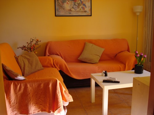 - Salón-comedor muy amplio con salida a una terraza que da a la piscina; dividido en zona de comedor con mesa extensible y mueble aparador y zona sala de estar con un sofá de 3 plazas y un sofá-cama de 1.35, muebles auxiliares y TV Led de 32".